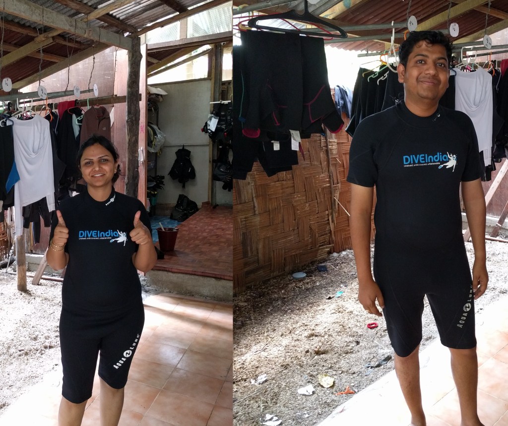 Next day brought another surprise for this hapless couple who didn’t know swimming and with fathomless fear of water had made a booking for Ocean Walk, considering it an exercise barely demanding a skill worthy of learning! Little did we know that a storm caused the ocean walk activity to get cancelled and we were presented with an option to go Scuba Diving instead. Bravehearts as we were, took the challenge head on and here we are all geared up!