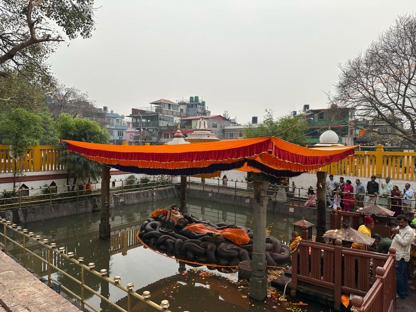 That evening, we visited the unique Budhanilkantha Temple, where a giant reclining Vishnu sleeps on a bed of serpents, surrounded by water.